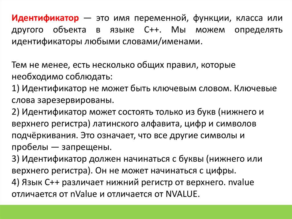 Идентификатор — это имя переменной, функции, класса илидругого объекта в языке C++. Мы можем определять