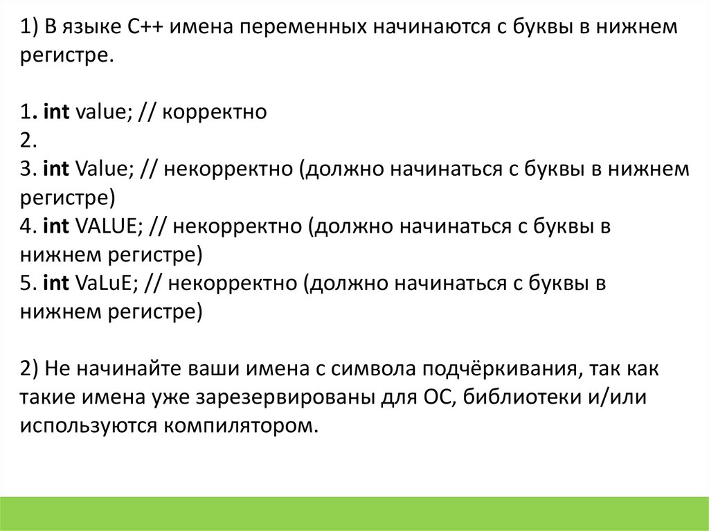 5. int VaLuE; // некорректно (должно начинаться с буквы в
