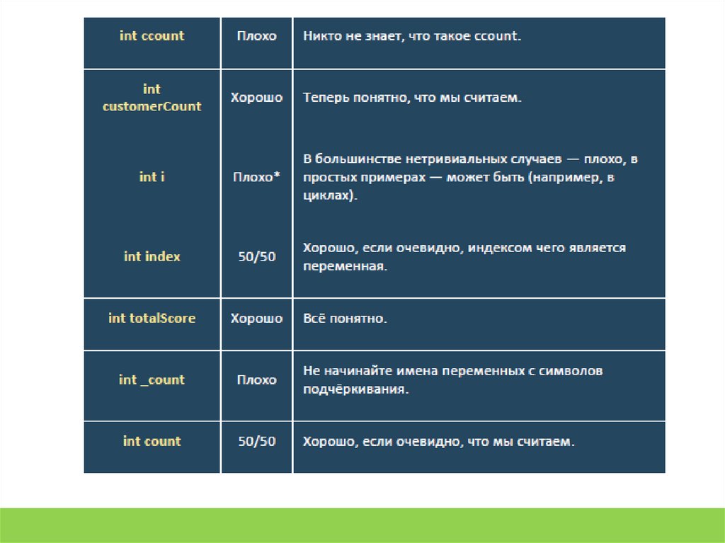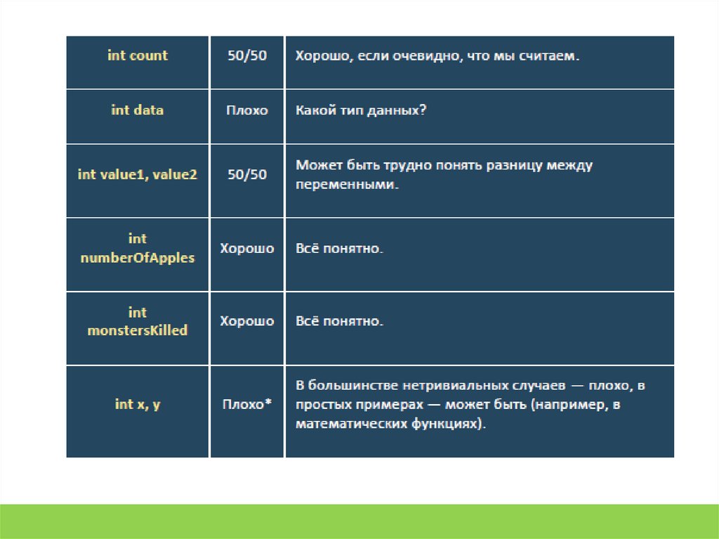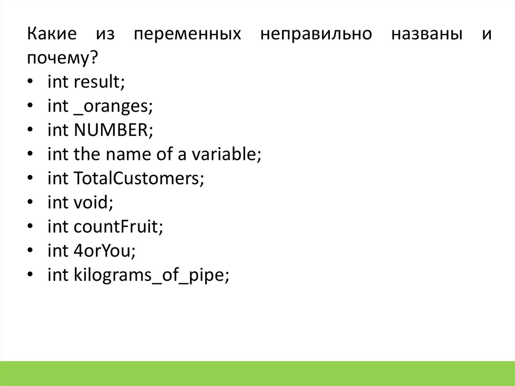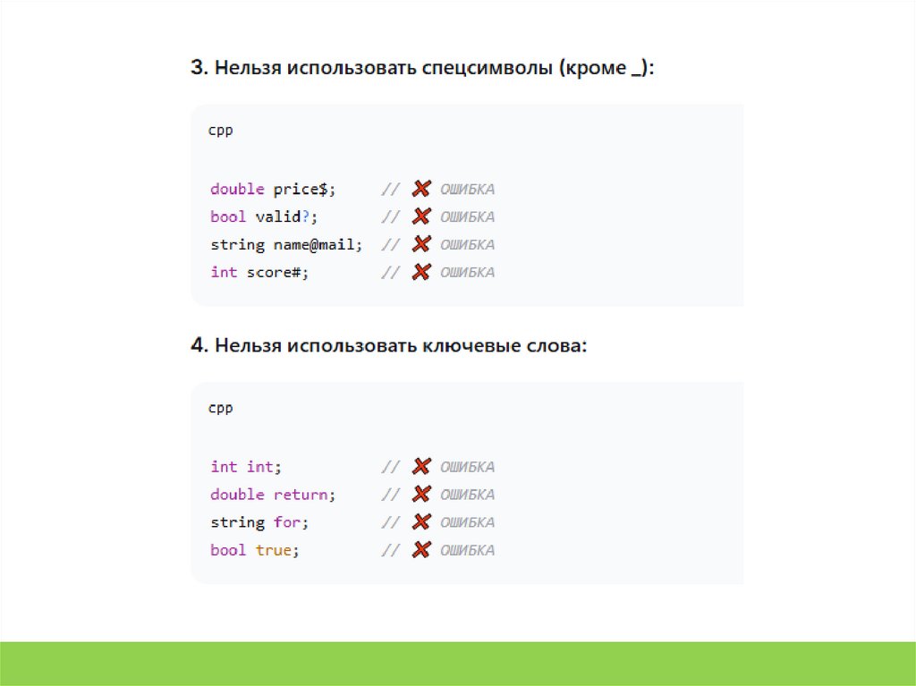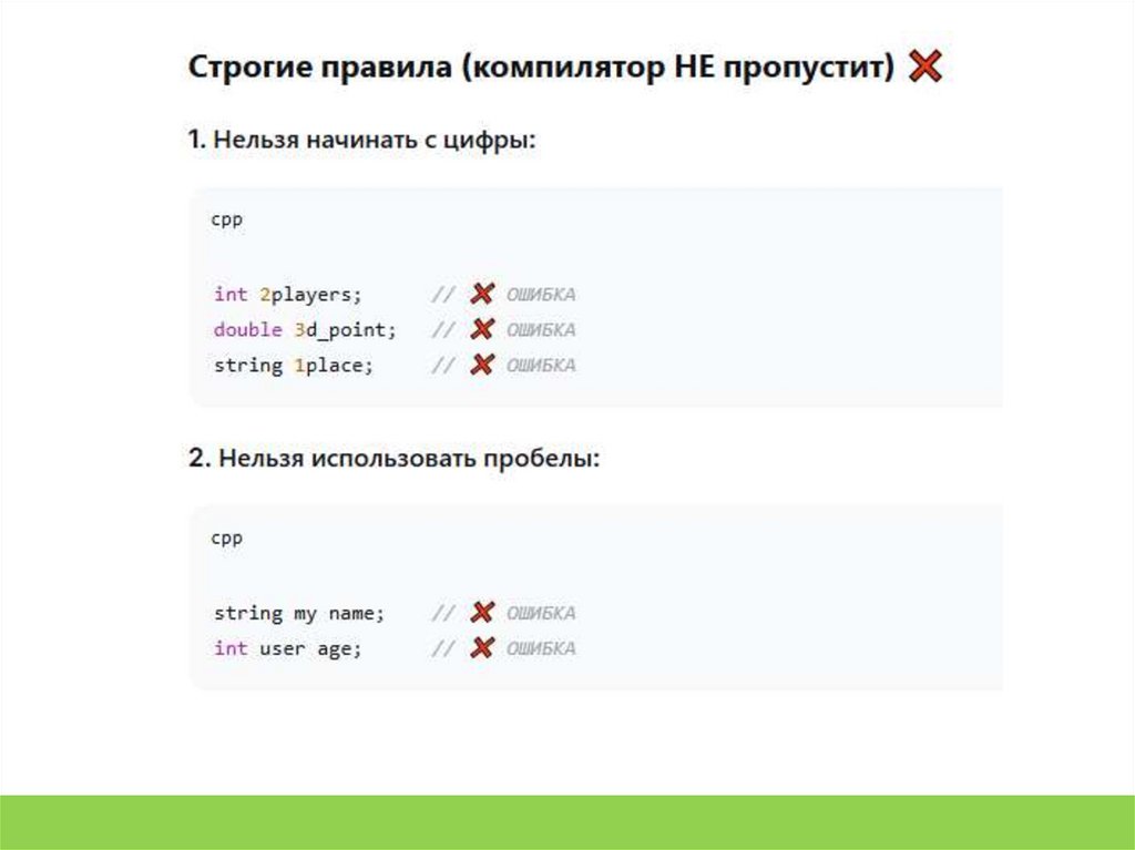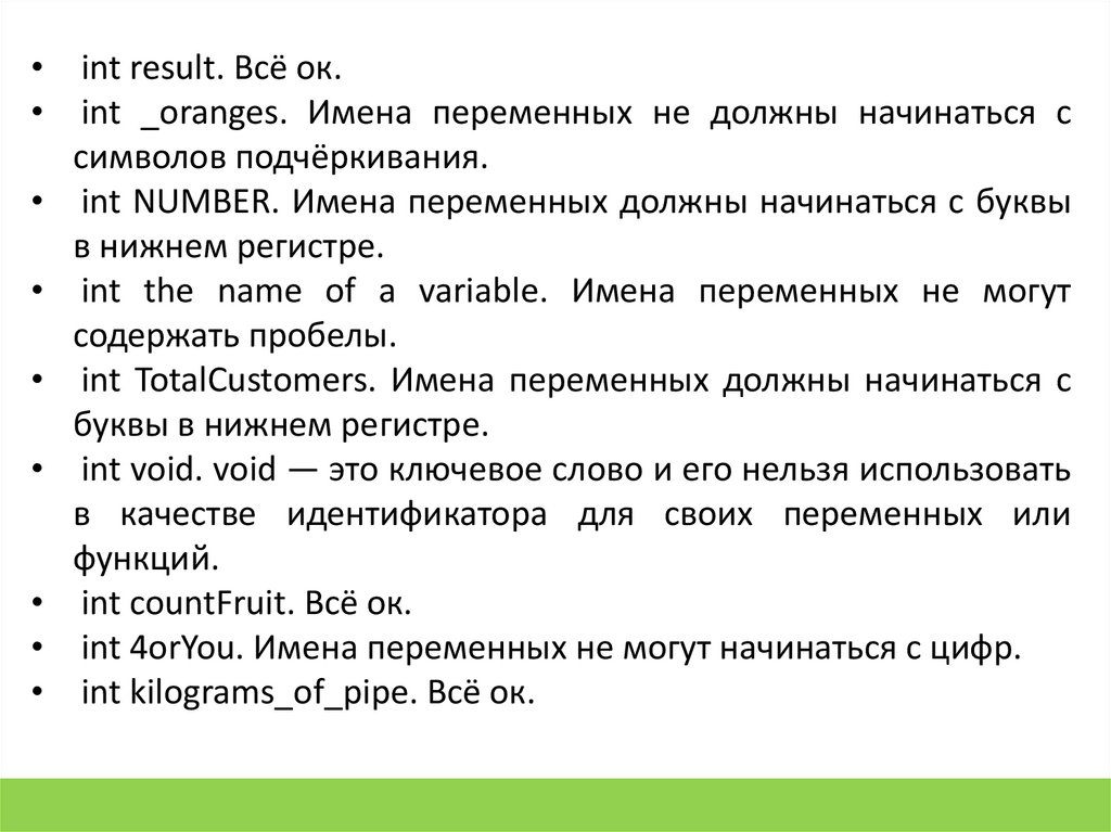 7. int my variable name; // некорректно (пробелы запрещены)