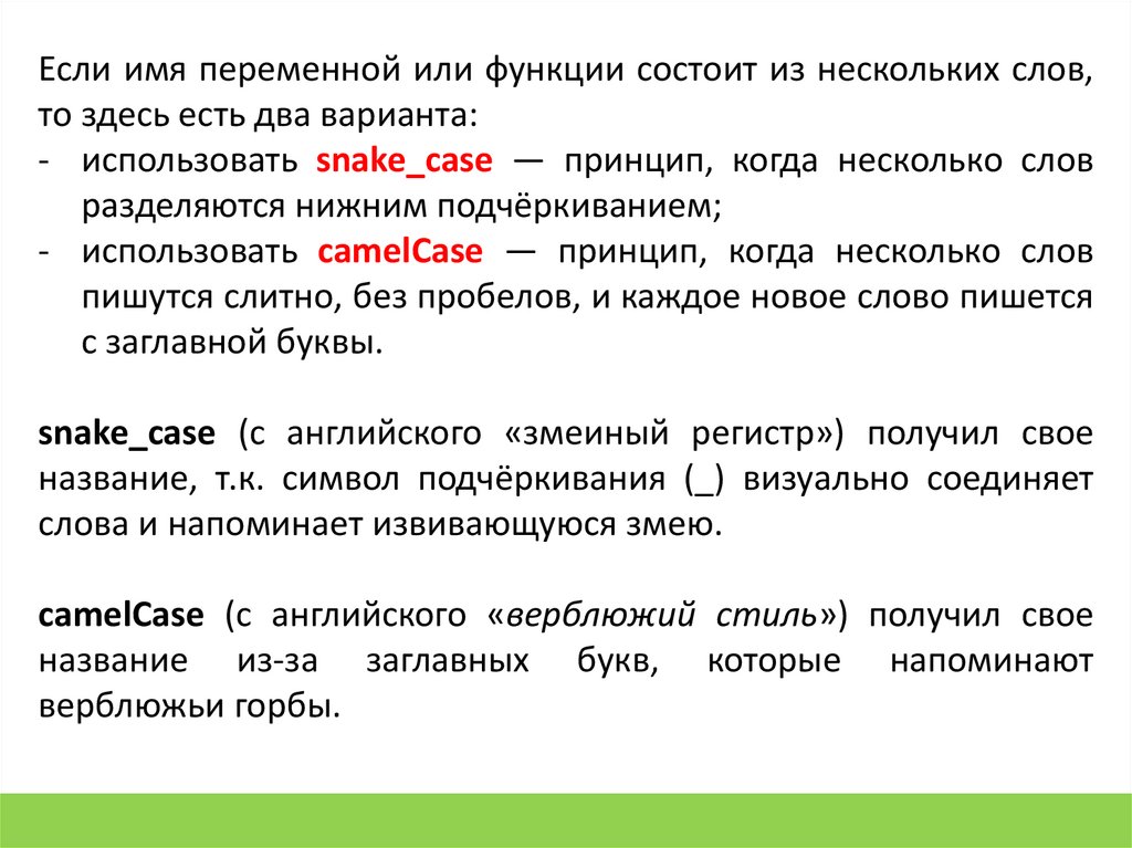 - использовать snake_case — принцип, когда несколько слов