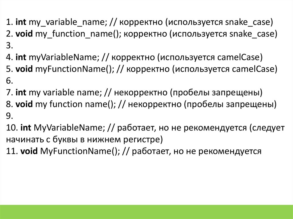 1. int my_variable_name; // корректно (используется snake_case)2. void my_function_name(); корректно (используется snake_case)