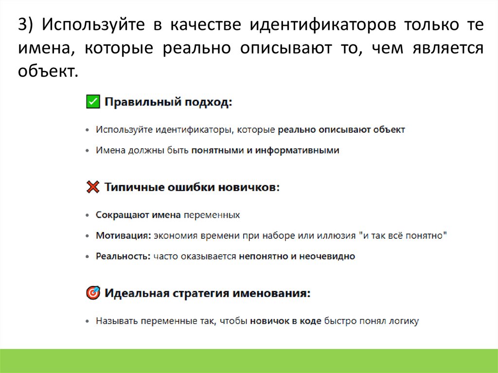 3) Используйте в качестве идентификаторов только теимена, которые реально описывают то, чем является