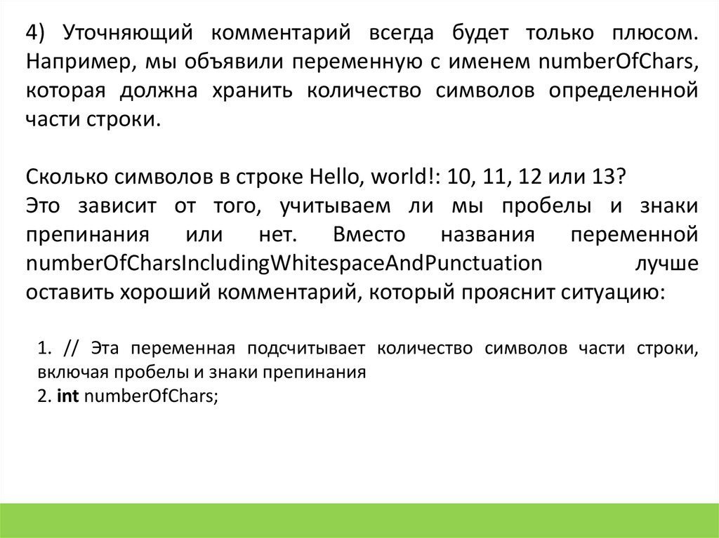 4) Уточняющий комментарий всегда будет только плюсом.Например, мы объявили переменную с именем numberOfChars,