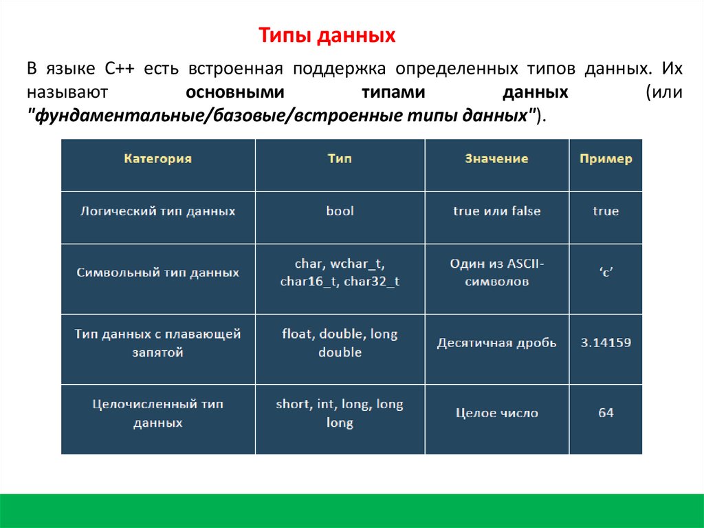 Типы данныхВ языке C++ есть встроенная поддержка определенных типов данных. Их