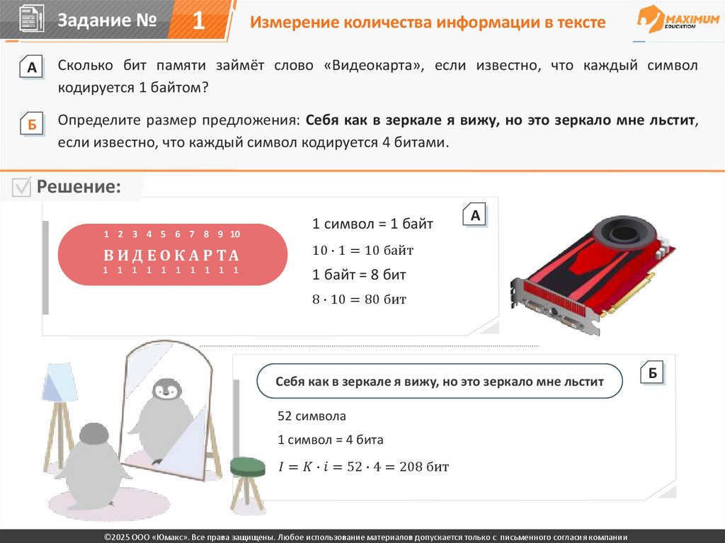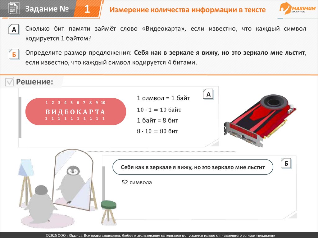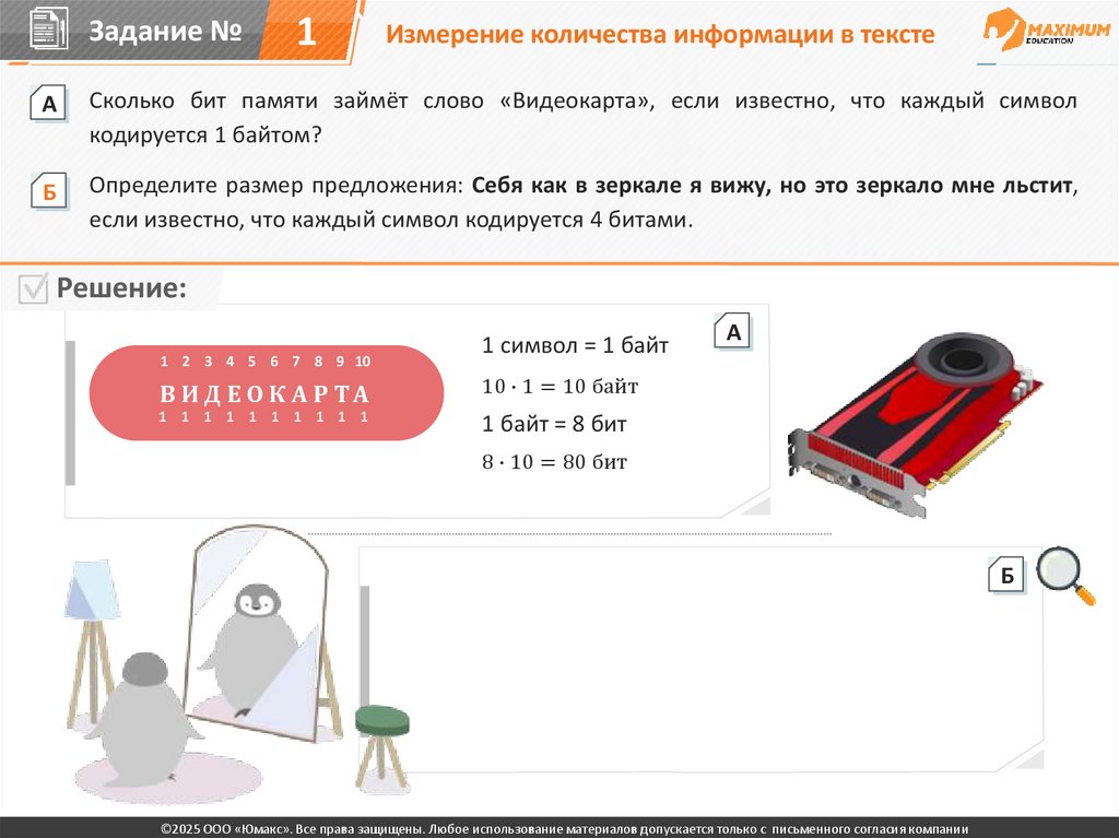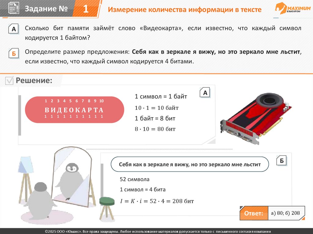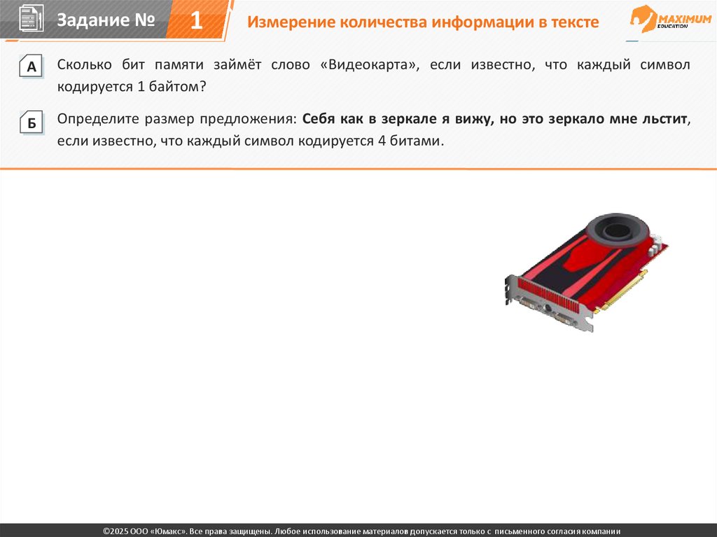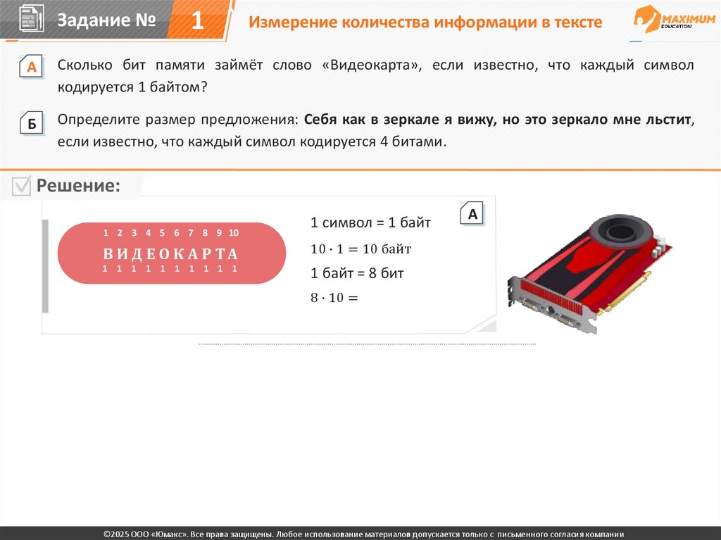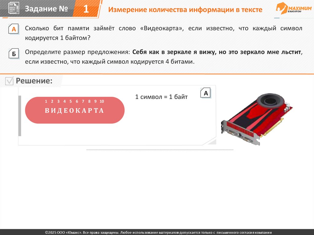 Сколько бит памяти займёт слово «Видеокарта», если известно, что каждый символ
