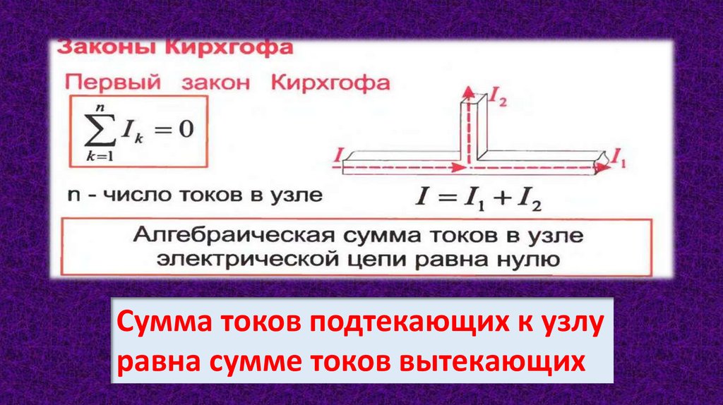 Сумма токов подтекающих к узлуравна сумме токов вытекающих