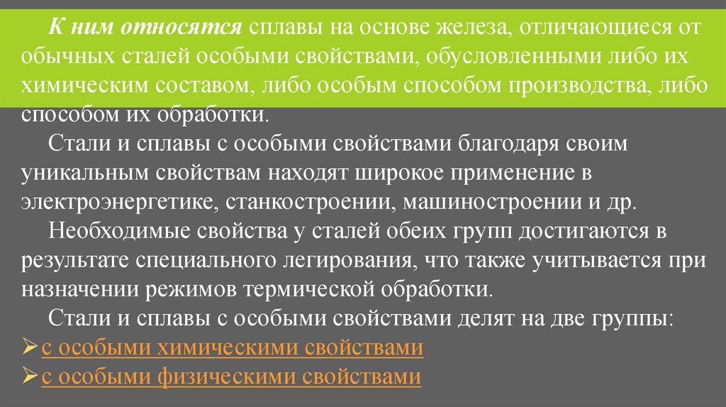К ним относятся сплавы на основе железа, отличающиеся отобычных сталей особыми свойствами, обусловленными либо их