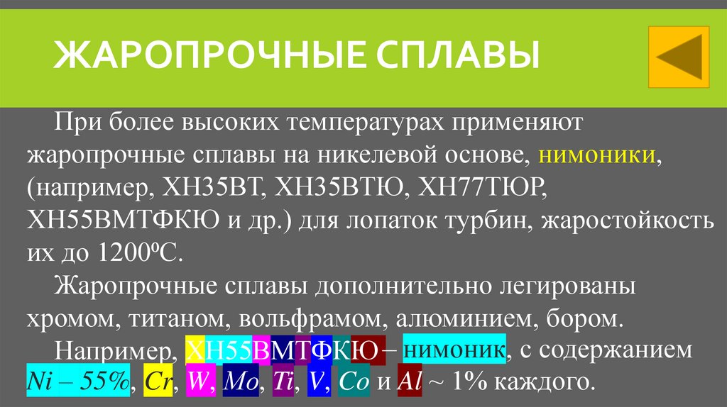 Например, ХН55ВМТФКЮ – нимоник, с содержанием