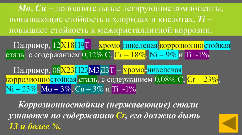 Mo, Cu – дополнительные легирующие компоненты,повышающие стойкость в хлоридах и кислотах, Ti –