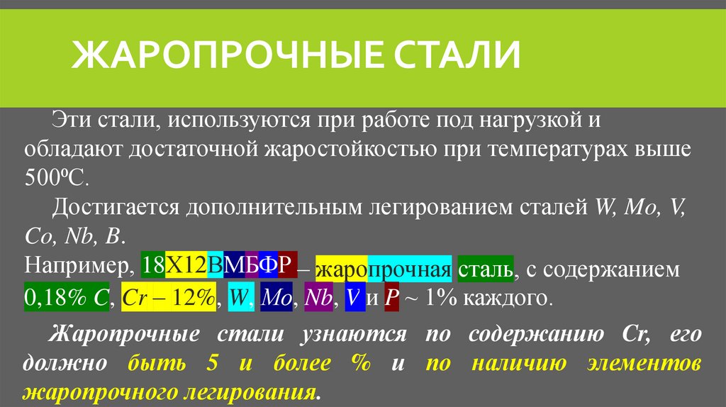 Например, 18Х12ВМБФР – жаропрочная сталь, с содержанием