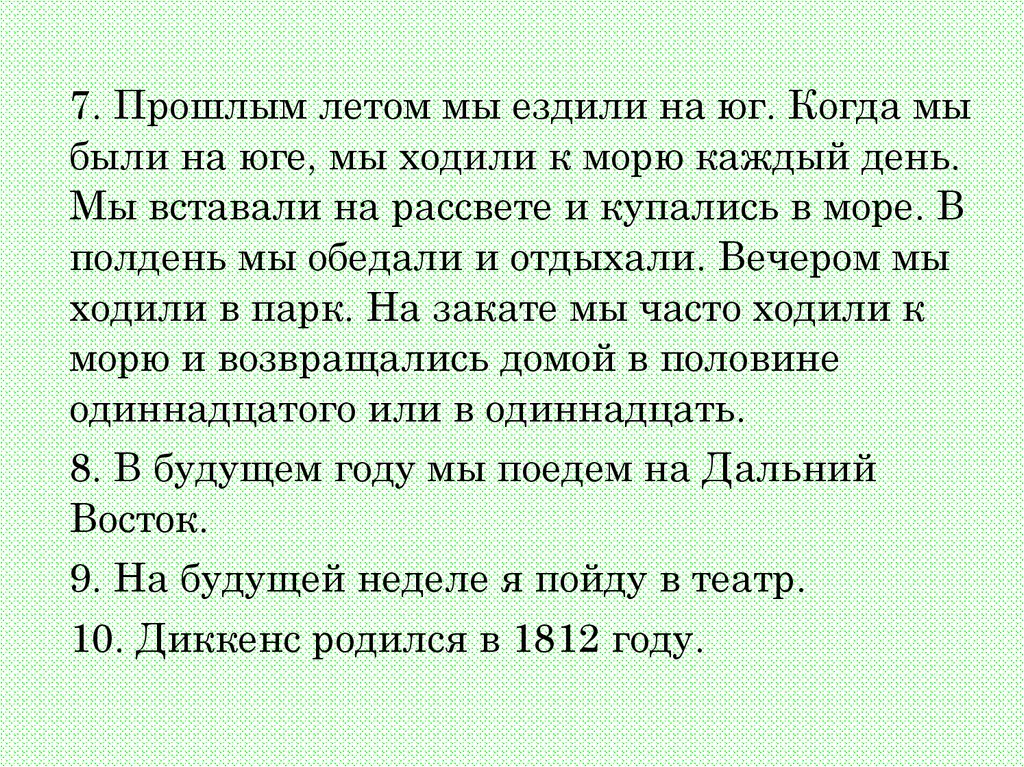 7. Прошлым летом мы ездили на юг. Когда мыбыли на юге, мы ходили к морю каждый день.
