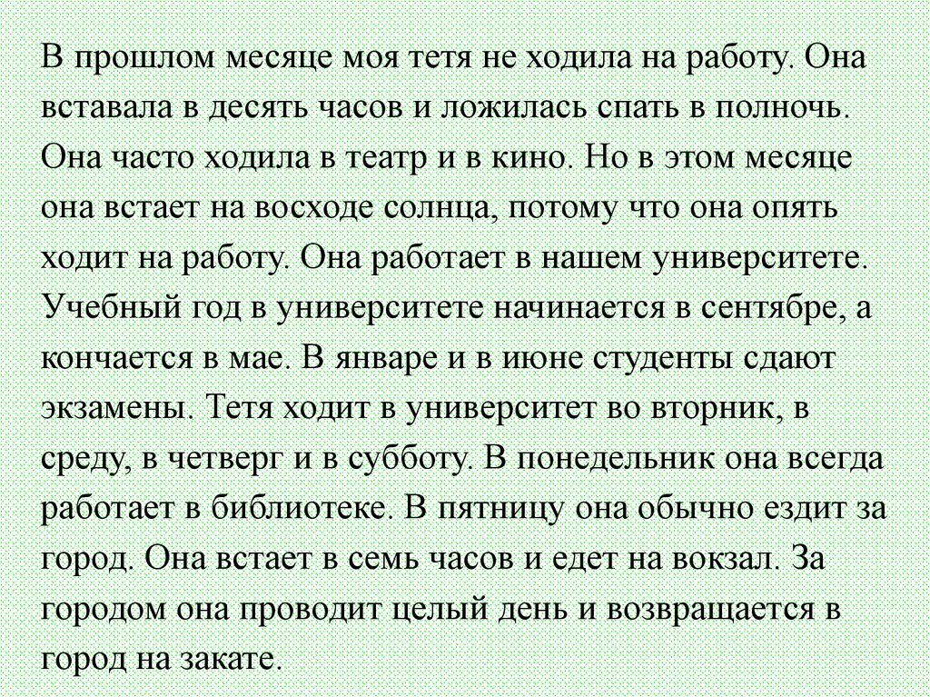 В прошлом месяце моя тетя не ходила на работу. Онавставала в десять часов и ложилась спать в полночь.