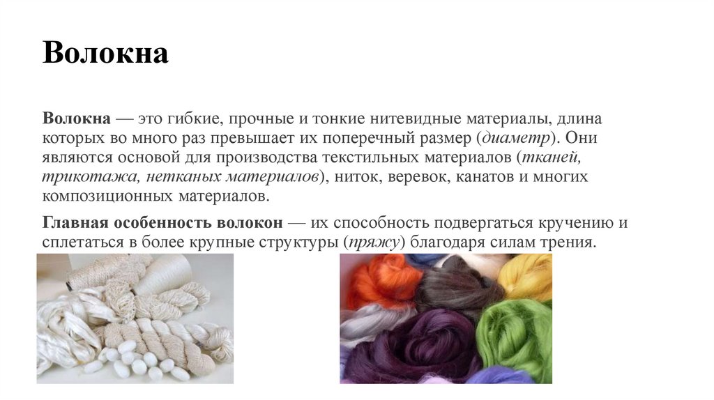 ВолокнаВолокна — это гибкие, прочные и тонкие нитевидные материалы, длина