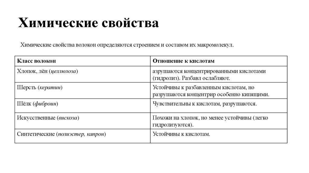 Химические свойстваХимические свойства волокон определяются строением и составом их макромолекул.
