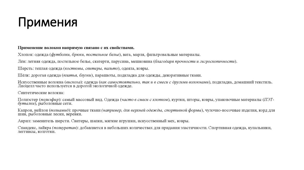 ПрименияПрименение волокон напрямую связано с их свойствами.