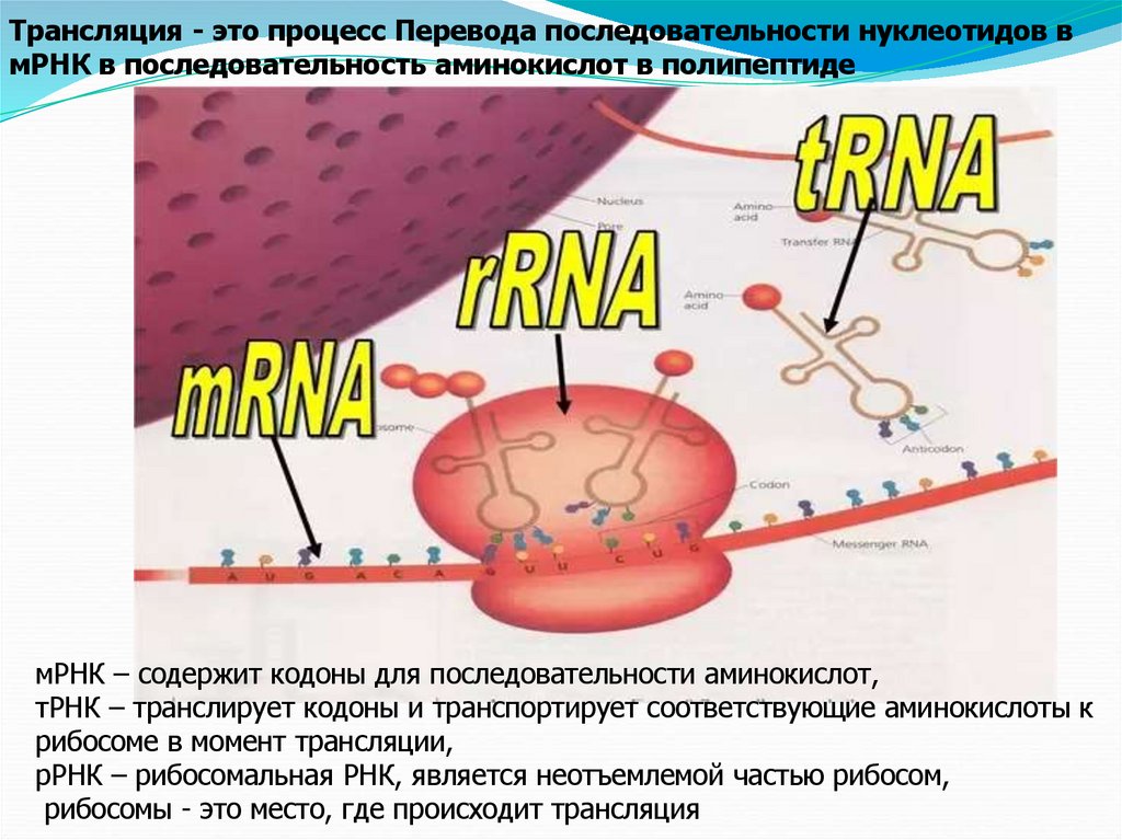 Трансляция - это процесс Перевода последовательности нуклеотидов вмРНК в последовательность аминокислот в полипептиде