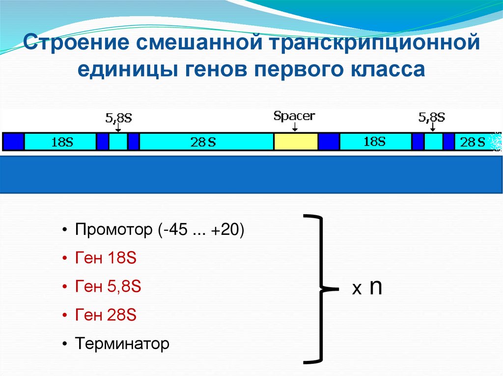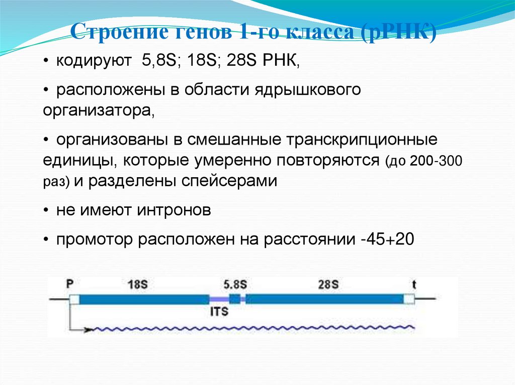 Строение генов 1-го класса (рРНК)• кодируют 5,8S; 18S; 28S РНК,