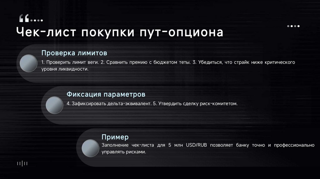 1. Проверить лимит веги. 2. Сравнить премию с бюджетом теты. 3. Убедиться, что страйк ниже критического
