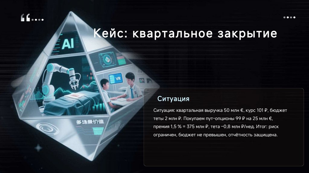 премия 1,5 % = 375 млн ₽, тета –0,8 млн ₽/нед. Итог: риск