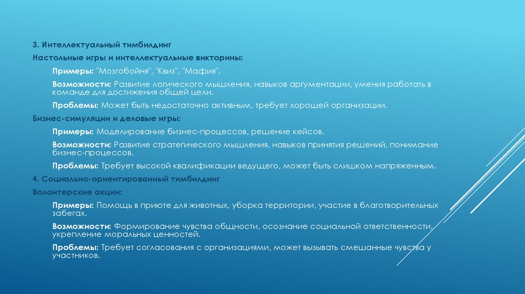 ФОРМАТЫ ТИМБИЛДИНГА МОЖНО УСЛОВНО РАЗДЕЛИТЬ НА НЕСКОЛЬКО КАТЕГОРИЙ: