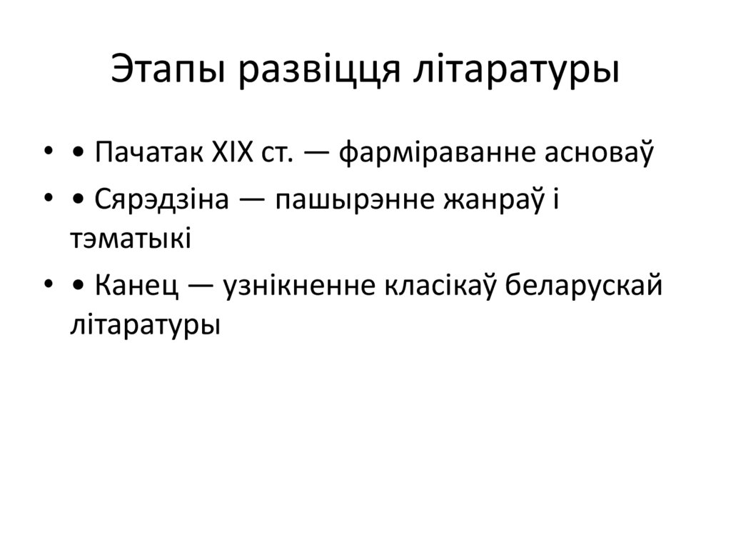 Этапы развіцця літаратуры• • Пачатак XIX ст. — фарміраванне асноваў