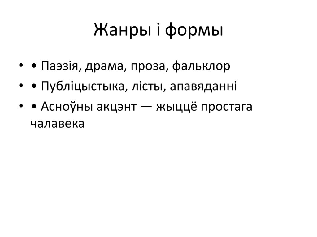 Жанры і формы• • Паэзія, драма, проза, фальклор