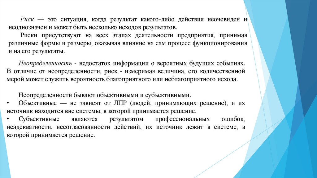 Риск — это ситуация, когда результат какого-либо действия неочевиден инеоднозначен и может быть несколько исходов результатов.