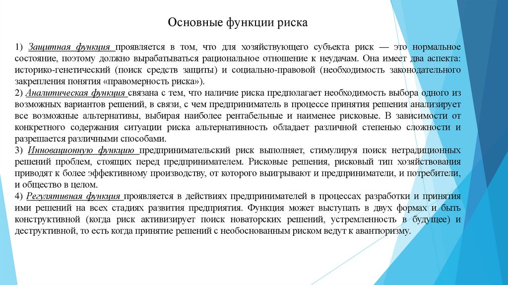 Основные функции риска1) Защитная функция проявляется в том, что для хозяйствующего субъекта риск — это нормальное