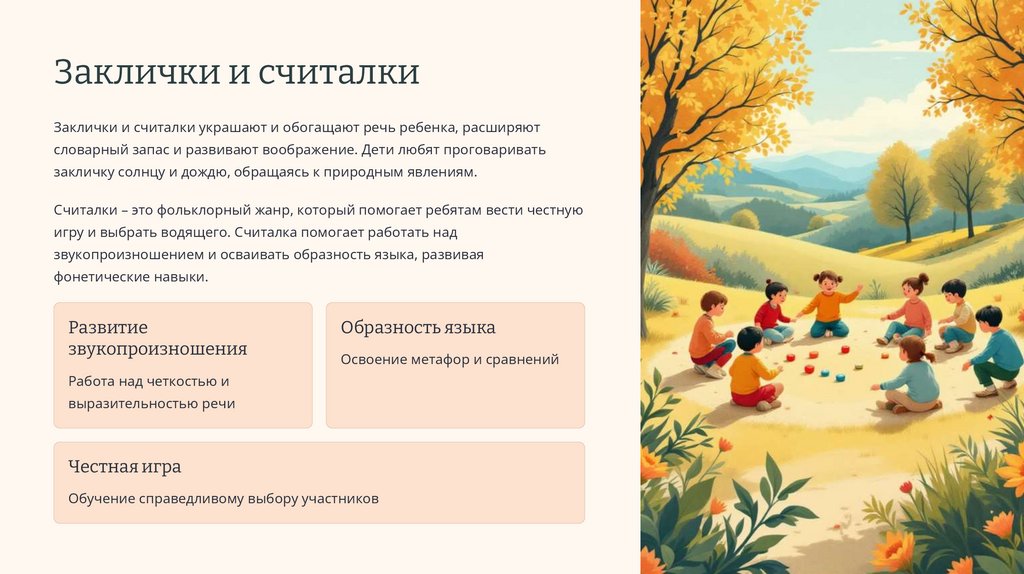 Организация подвижных игр с использованием считалок, закличек и народных песен. Это
