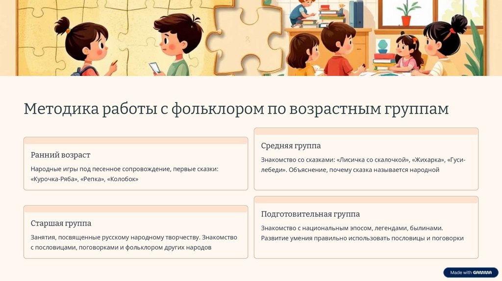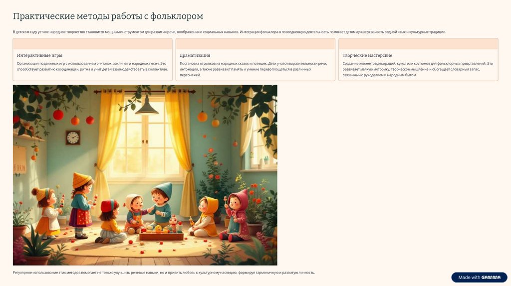 Практические методы работы с фольклоромВ детском саду устное народное творчество становится мощным инструментом для развития речи, воображения и социальных навыков. Интеграция фольклора в повседневную деятельность помогает детям лучше усваивать родной язык и культурные традиции.