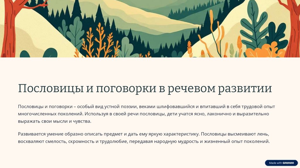 Пословицы и поговорки в речевом развитииПословицы и поговорки – особый вид устной поэзии, веками шлифовавшийся и впитавший в себя трудовой опыт