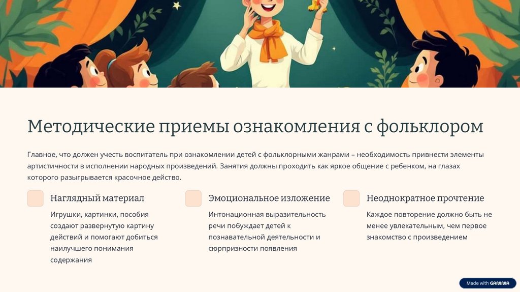 Методические приемы ознакомления с фольклоромГлавное, что должен учесть воспитатель при ознакомлении детей с фольклорными жанрами – необходимость привнести элементы
