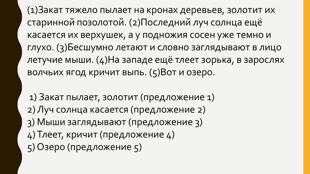 (1)Закат тяжело пылает на кронах деревьев, золотит ихстаринной позолотой. (2)Последний луч солнца ещё