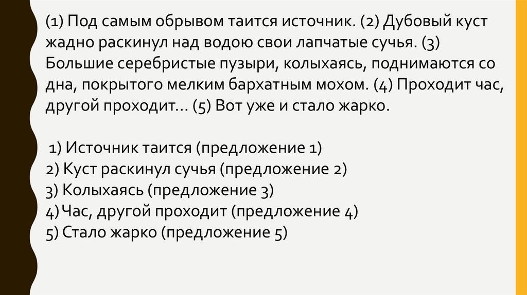 (1) Под самым обрывом таится источник. (2) Дубовый кустжадно раскинул над водою свои лапчатые сучья. (3)