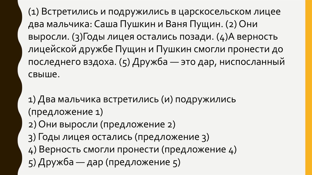 (1) Встретились и подружились в царскосельском лицеедва мальчика: Саша Пушкин и Ваня Пущин. (2) Они