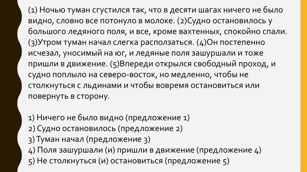 (1) Ночью туман сгустился так, что в десяти шагах ничего не быловидно, словно все потонуло в молоке. (2)Судно остановилось у