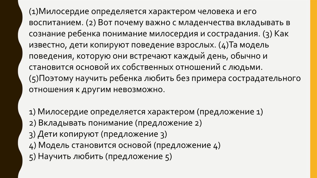 (1)Милосердие определяется характером человека и еговоспитанием. (2) Вот почему важно с младенчества вкладывать в