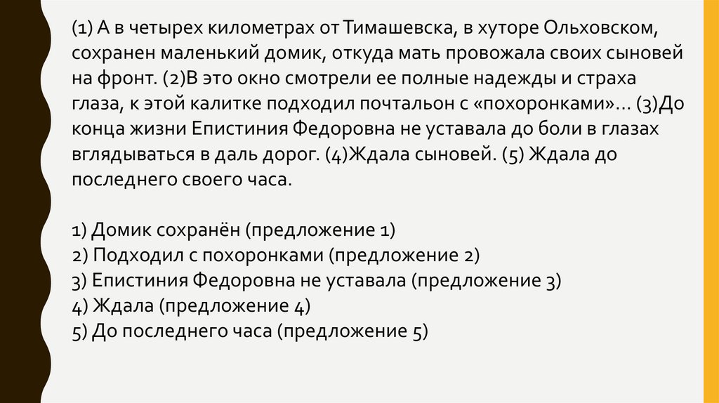 вглядываться в даль дорог. (4)Ждала сыновей. (5) Ждала до