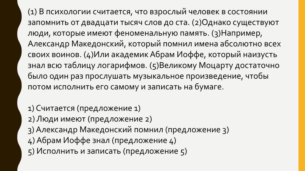 (1) В психологии считается, что взрослый человек в состояниизaпомнить от двaдцaти тысяч слов до стa. (2)Однако существуют