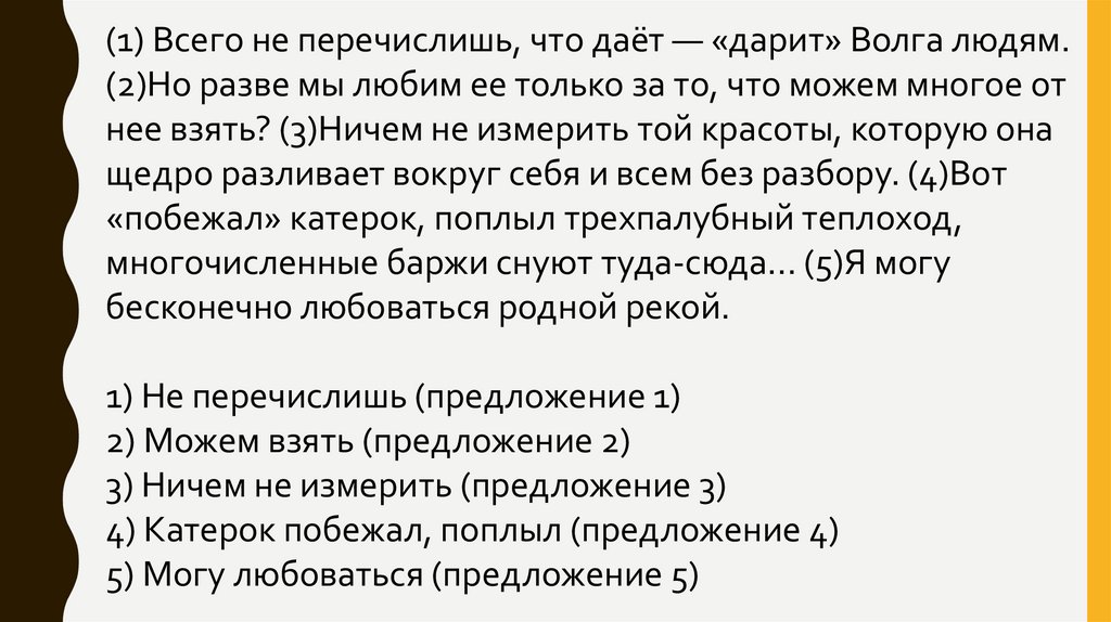 (1) Всего не перечислишь, что даёт — «дарит» Волга людям.(2)Но разве мы любим ее только за то, что можем многое от