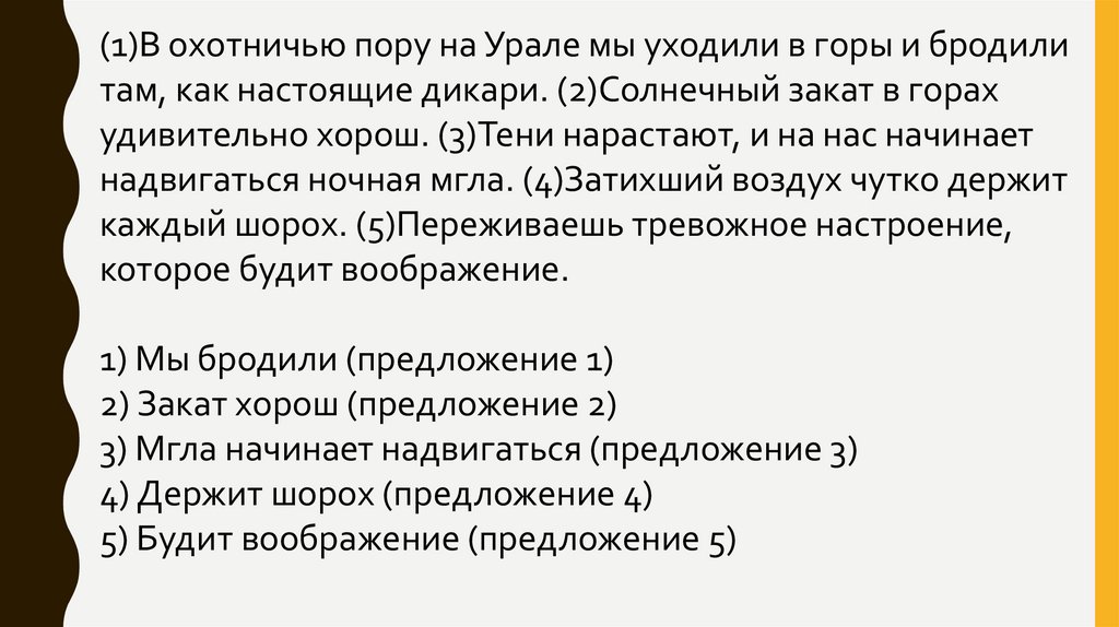 (1)В охотничью пору на Урале мы уходили в горы и бродилитам, как настоящие дикари. (2)Солнечный закат в горах
