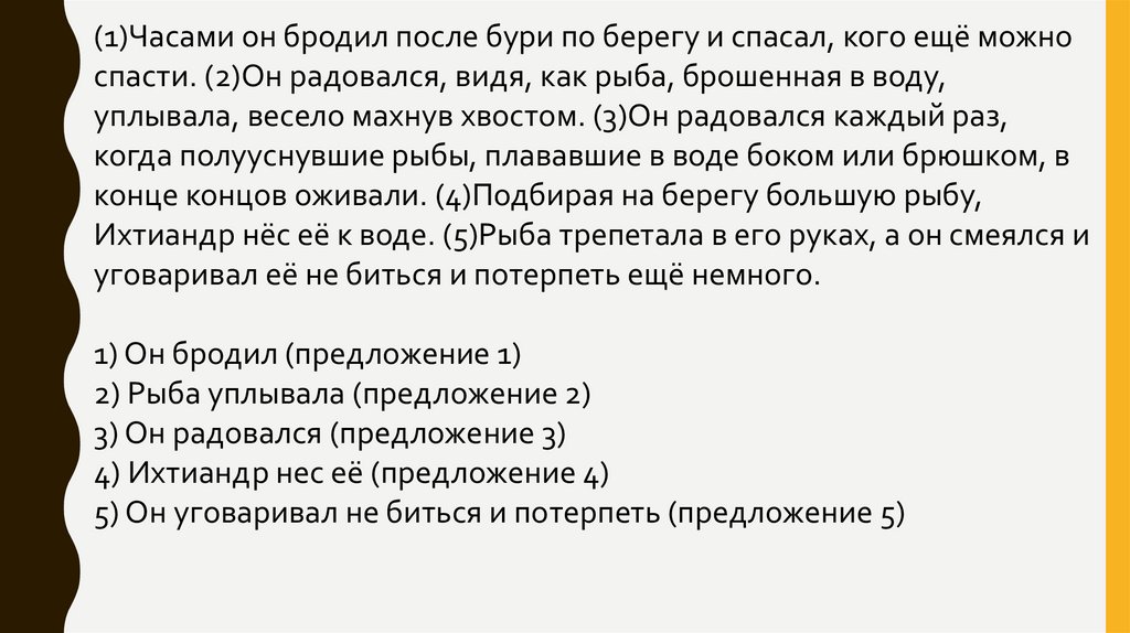 (1)Часами он бродил после бури по берегу и спасал, кого ещё можноспасти. (2)Он радовался, видя, как рыба, брошенная в воду,