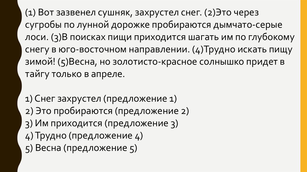 (1) Вот зазвенел сушняк, захрустел снег. (2)Это черезсугробы по лунной дорожке пробираются дымчато-серые