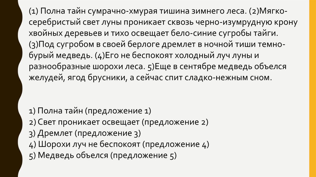 (1) Полна тайн сумрачно-хмурая тишина зимнего леса. (2)Мягкосеребристый свет луны проникает сквозь черно-изумрудную кронухвойных деревьев и тихо освещает бело-синие сугробы тайги.