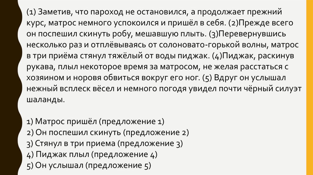 (1) Заметив, что пароход не остановился, а продолжает прежнийкурс, матрос немного успокоился и пришёл в себя. (2)Прежде всего