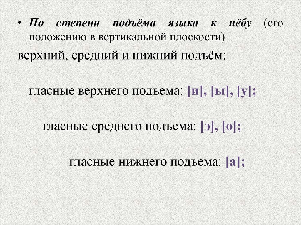 • По степени подъёма языка к нёбуположению в вертикальной плоскости)