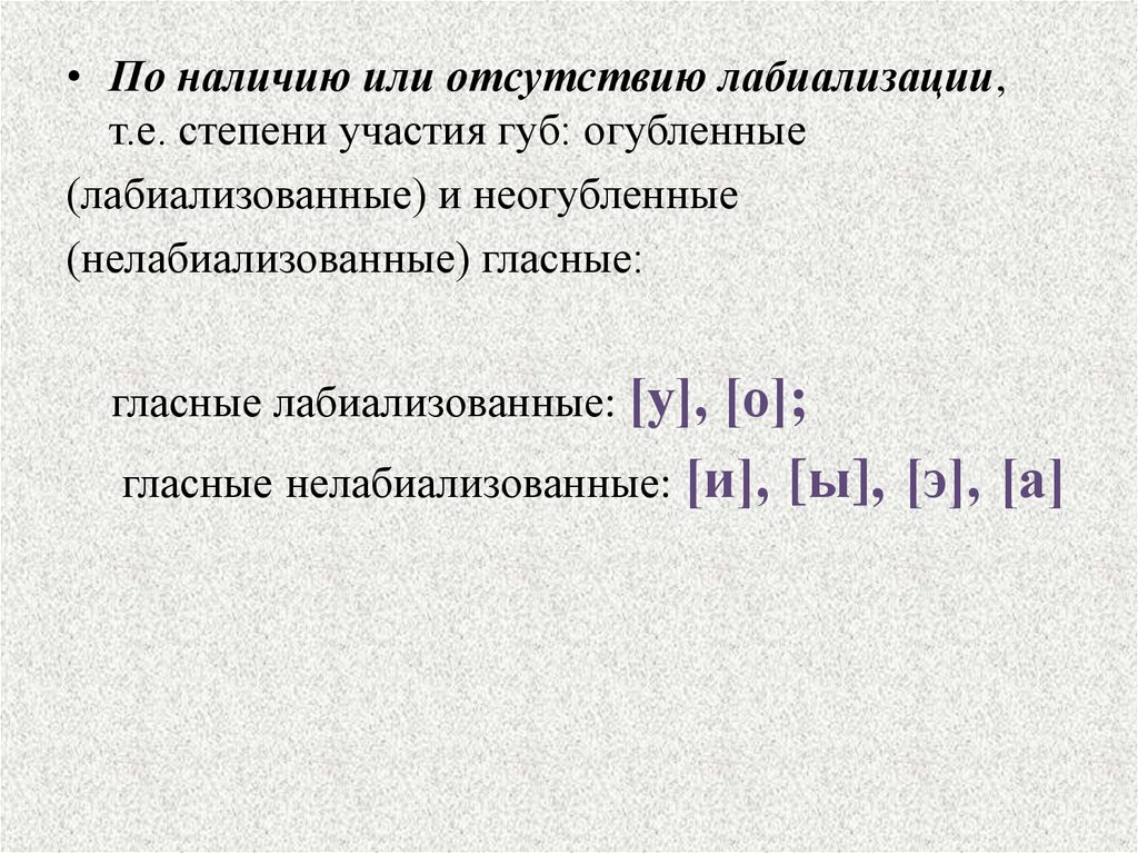 • По наличию или отсутствию лабиализации,т.е. степени участия губ: огубленные
