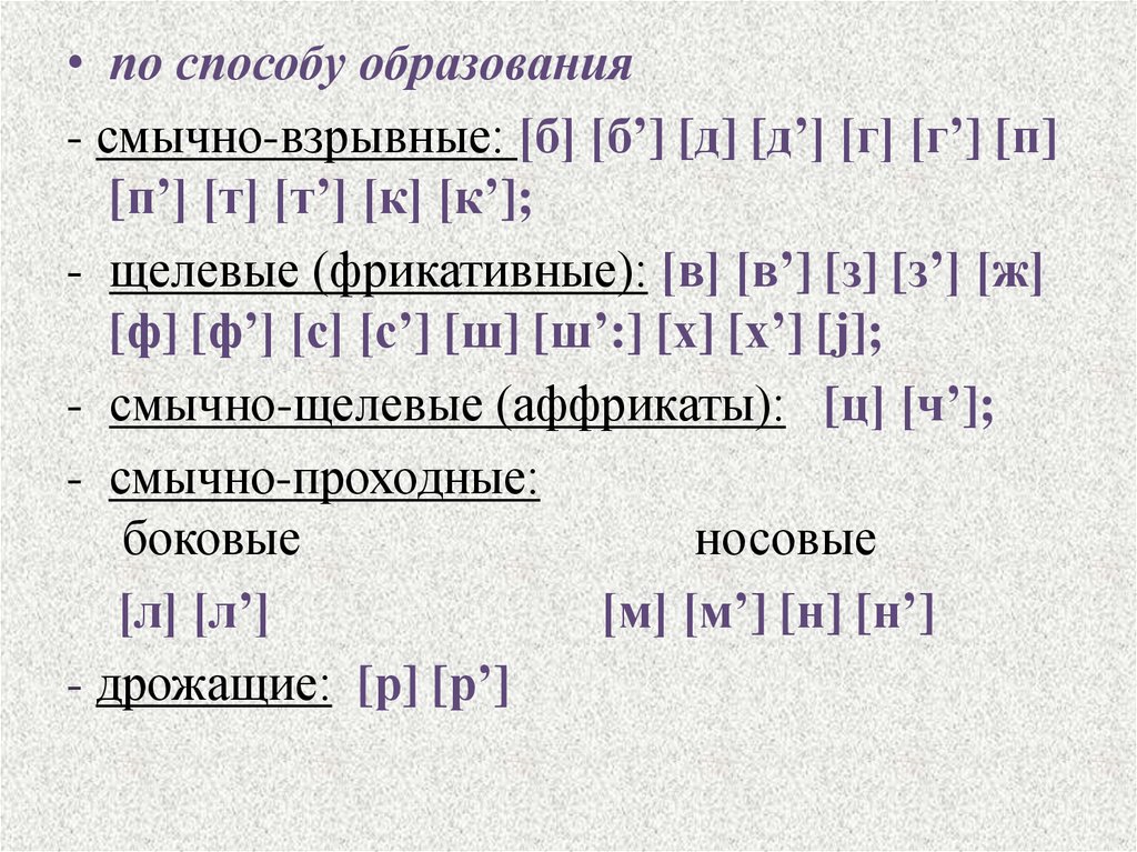 • по способу образования- смычно-взрывные: [б] [б’] [д] [д’] [г] [г’] [п]