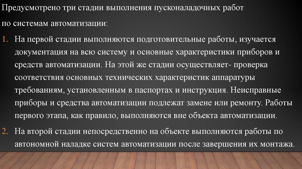 Предусмотрено три стадии выполнения пусконаладочных работпо системам автоматизации: