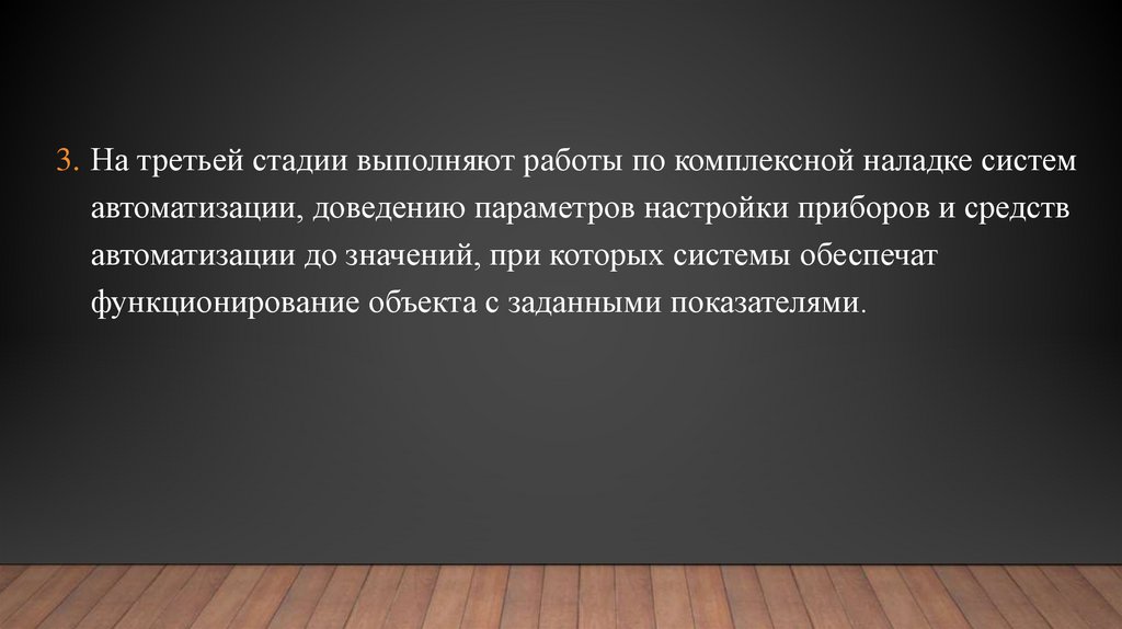 3. На третьей стадии выполняют работы по комплексной наладке системавтоматизации, доведению параметров настройки приборов и средств